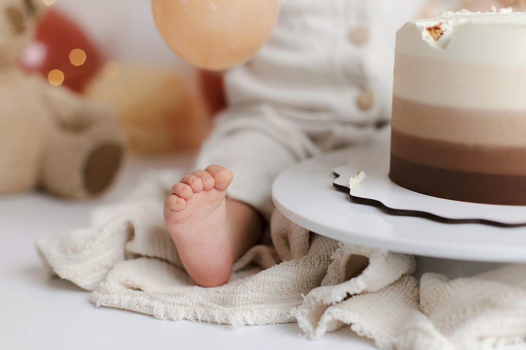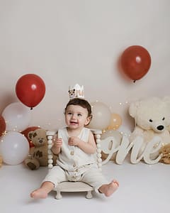 Une séance smash the cake est idéale autour du premier anniversaire de bébé, généralement entre 11 et 12 mois.